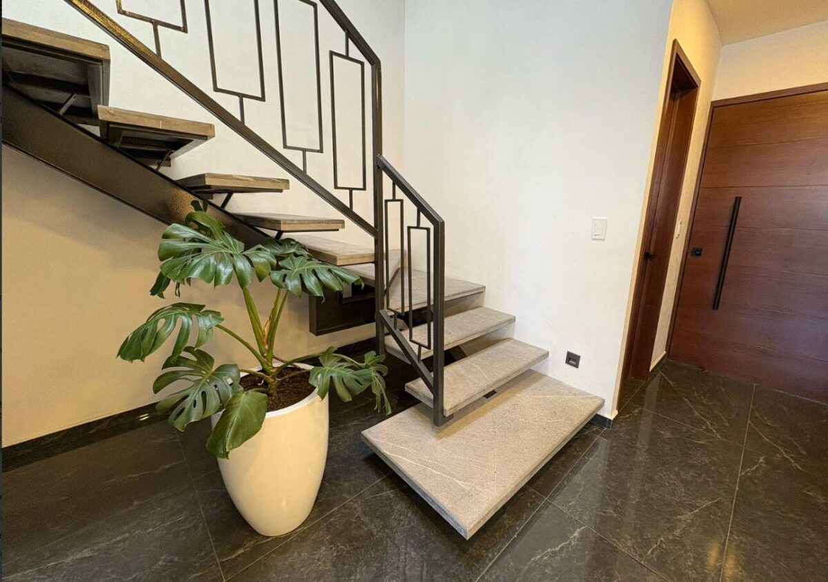 P.B.: Estancia, sala comedor, despacho, cocina abierta equipada con cubierta de granito y gabinetes al alto brillo, 1 medio baño de visitas, jardín trasero, 2 lugares de estacionamiento techados.